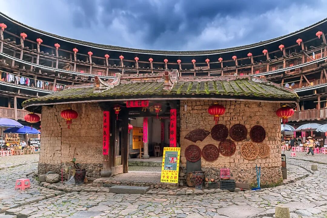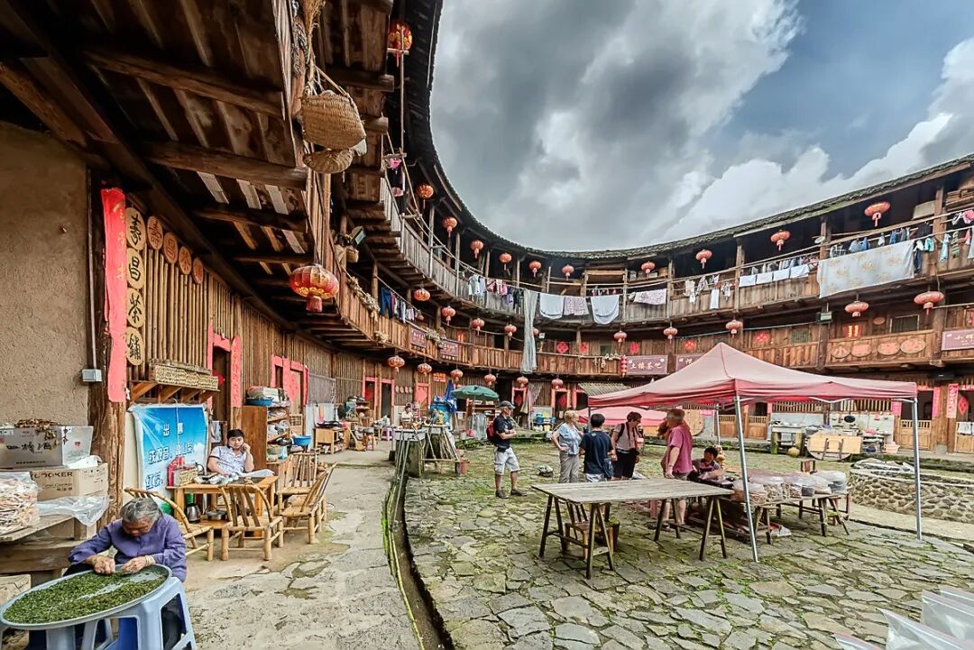 田螺坑土楼は、4つの丸い楼が1つの方形の楼を囲む独特な構造で、「四菜一湯」と呼ばれています。まるで昔の映画のワンシーンのような風景に、思わず写真を撮りまくりたくなります。