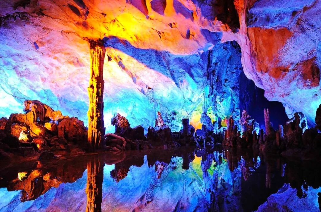 その後、桂林市内に戻り、中国で最も代表的な鍾乳石洞窟の一つである蘆笛岩を観光します。洞窟内には、奇妙な形状の岩石が数多くあり、さまざまな動物や神獣を模した石柱などが見られます。